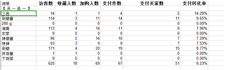 3.打开下载好的表格,留下访客数,收藏人数,加购人数,支付件数,支付买家数,支付转化率。