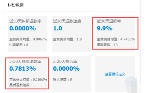 然后就是店铺的退款率,退款速度,品质退款率等等,不说要做得多好,起码不能被同行平均比了下去,淘宝官方没有特定的指标说这些指标做得不好对自然流量影响有多大,不过根据实际案例,退款指标不达标的店铺,发展瓶颈会来得很早,会发现越来越难冲上去。